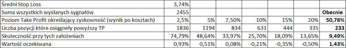 Średni Stop Loss wynosi 3,74% – jest to średnia wartość potencjalnej straty z uwzględnieniem kosztów jej realizacji, czyli kosztów nabycia i zbycia akcji na poziomie 0,2% od obu transakcji.