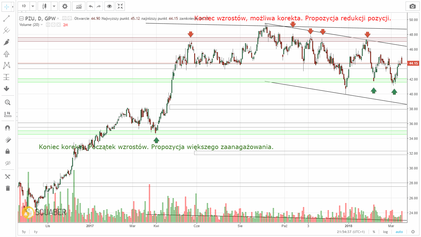 - aktywację strefy popytu jako koniec korekty w trendzie wzrostowym i sygnał do zwiększenia zaangażowania w akcję danej spółki.