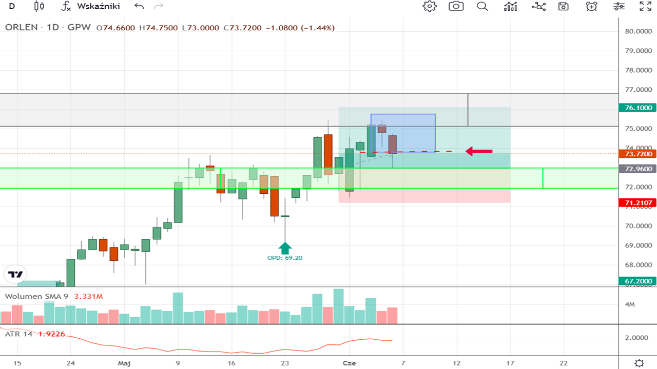 Sprzedaż akcji Orlen S.A. (PKN:GPW). Zamknięcie pozycji na poziomie Stop loss wynikającym z prowadzenia pozycji po ATR. Transakcja przyniosła 1,14% zysku po 7 dniach.