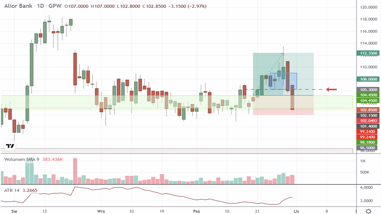 Sprzedaż akcji Alior Bank S.A. (ALR:GPW). Zamknięcie pozycji na poziomie Stop loss wynikającym z prowadzenia pozycji po ATR. Transakcja przyniosła 4,10% zysku po 20 dniach.