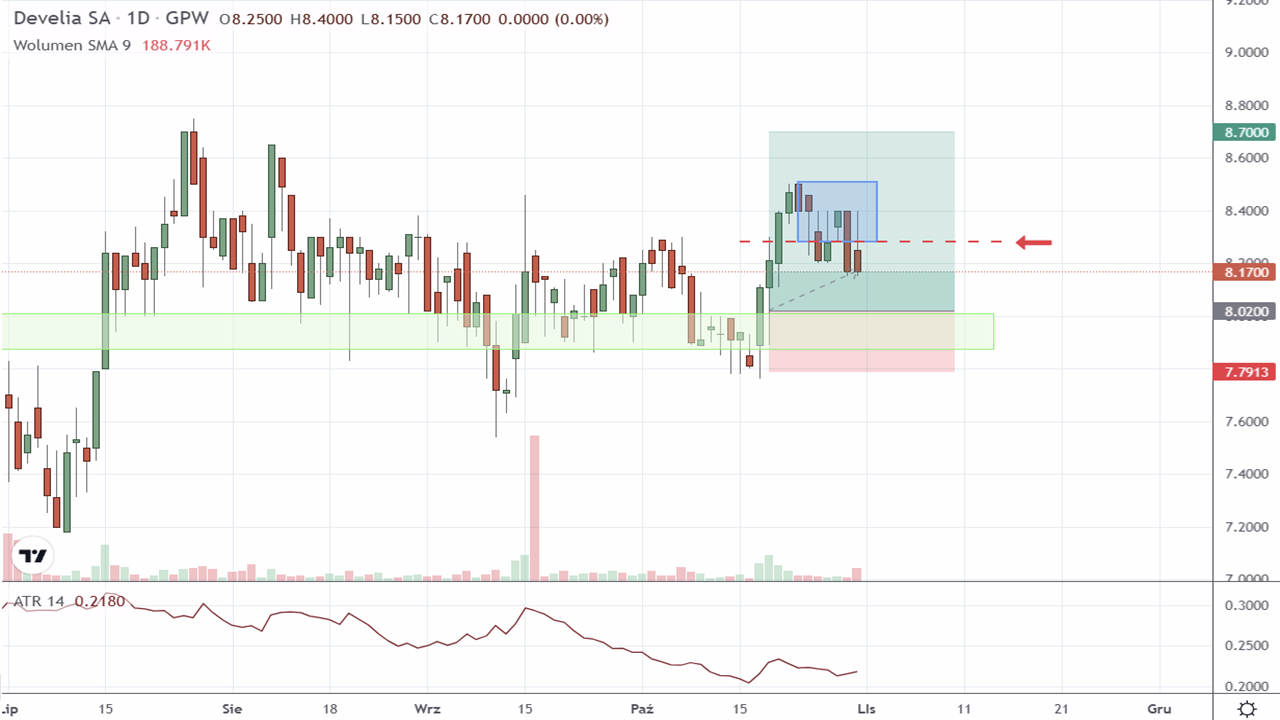 Sprzedaż akcji Develia S.A. (DVL:GPW). Zamknięcie pozycji na poziomie Stop loss wynikającym z prowadzenia pozycji po ATR. Transakcja przyniosła 3,24% zysku po 7 dniach.