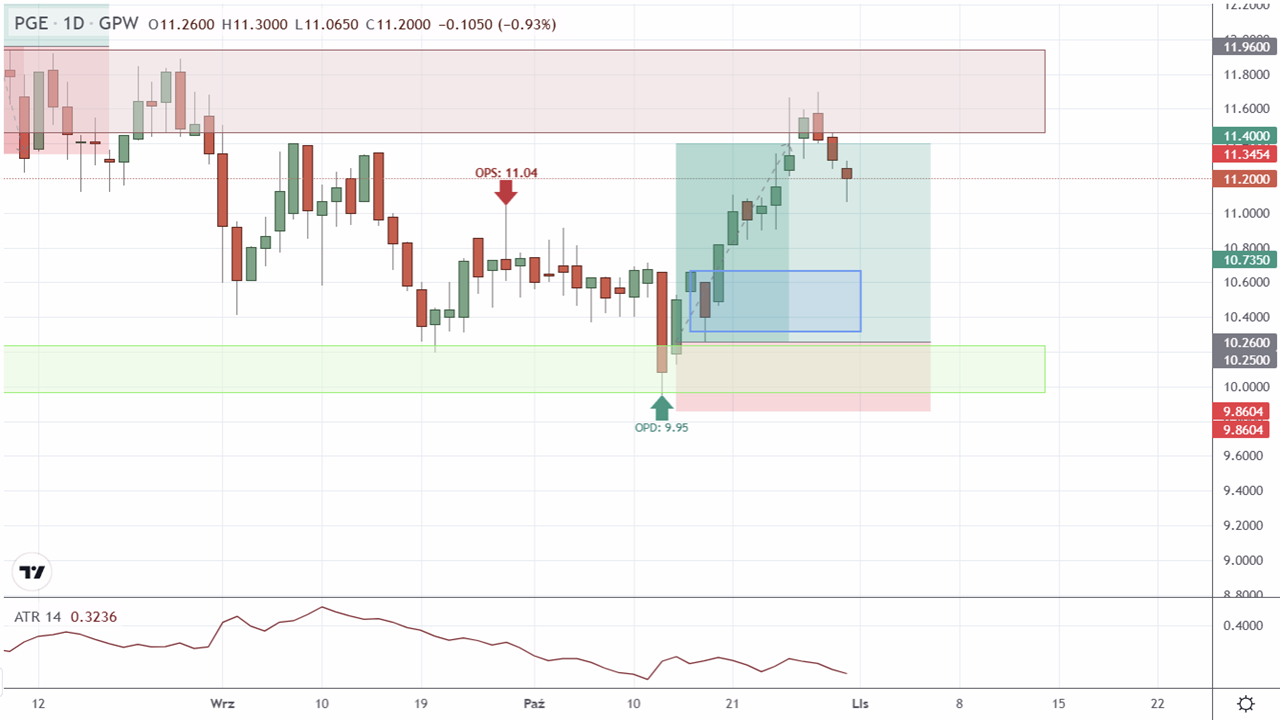 Sprzedaż akcji PGE S.A. (PGE:GPW). Realizacja zakładanego poziomu Take profit. Transakcja przyniosła 11,11% zysku po 12 dniach.