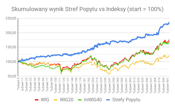 406. tydzień Stref Popytu przyniósł 3 sygnałów reakcji na strefę popytu Squabera. Dwa z nich zostały wykorzystane do przeprowadzenia transakcji kupna. Akcje PGE S.A. (PGE:GPW) oraz Develia S.A. (DVL:GPW), Budimex S.A. (BDX:GPW), Alior Bank S.A. (ALR:GPW), Allegro S.A. (ALE:GPW) oraz PZU S.A. (PZU:GPW) z którymi rozpoczynaliśmy tydzień, opuściły portfel, przynosząc zysk.
