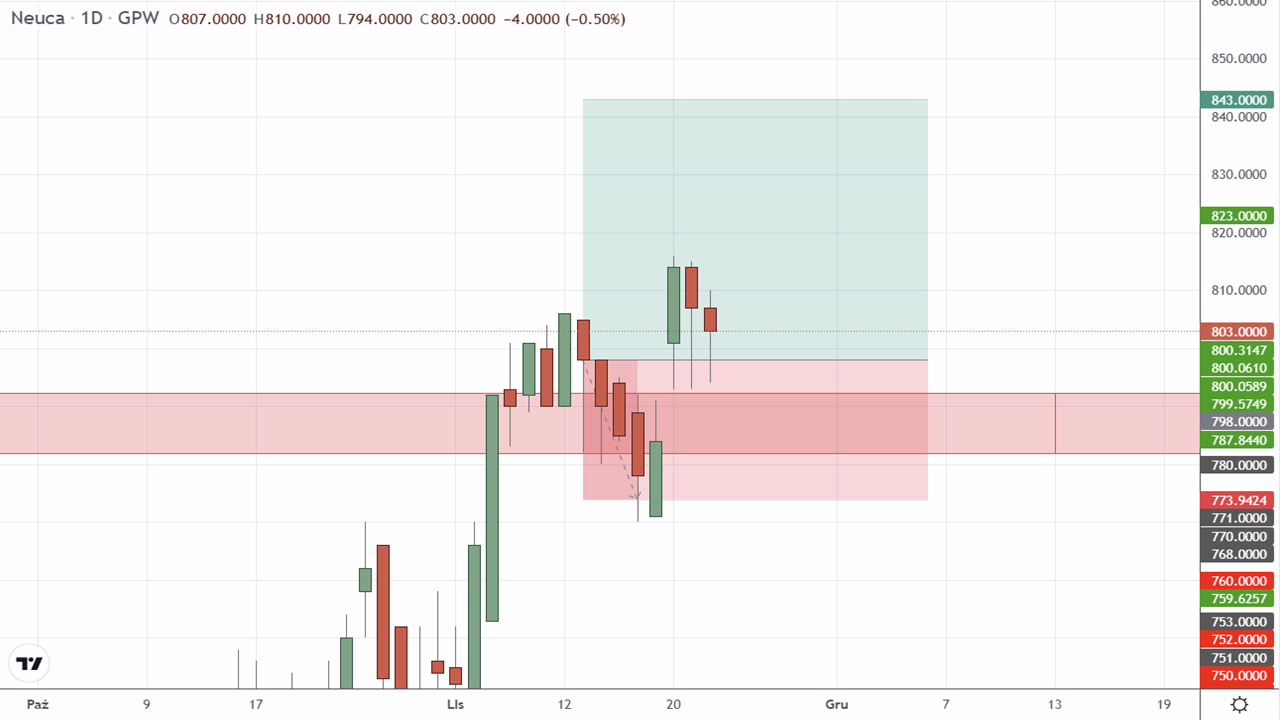 Sprzedaż akcji Neuca S.A. (NEU:GPW). Zamknięcie pozycji z powodu aktywacji strefy podaży Squabera. Transakcja przyniosła 0,50% zysku po 11 dniach.