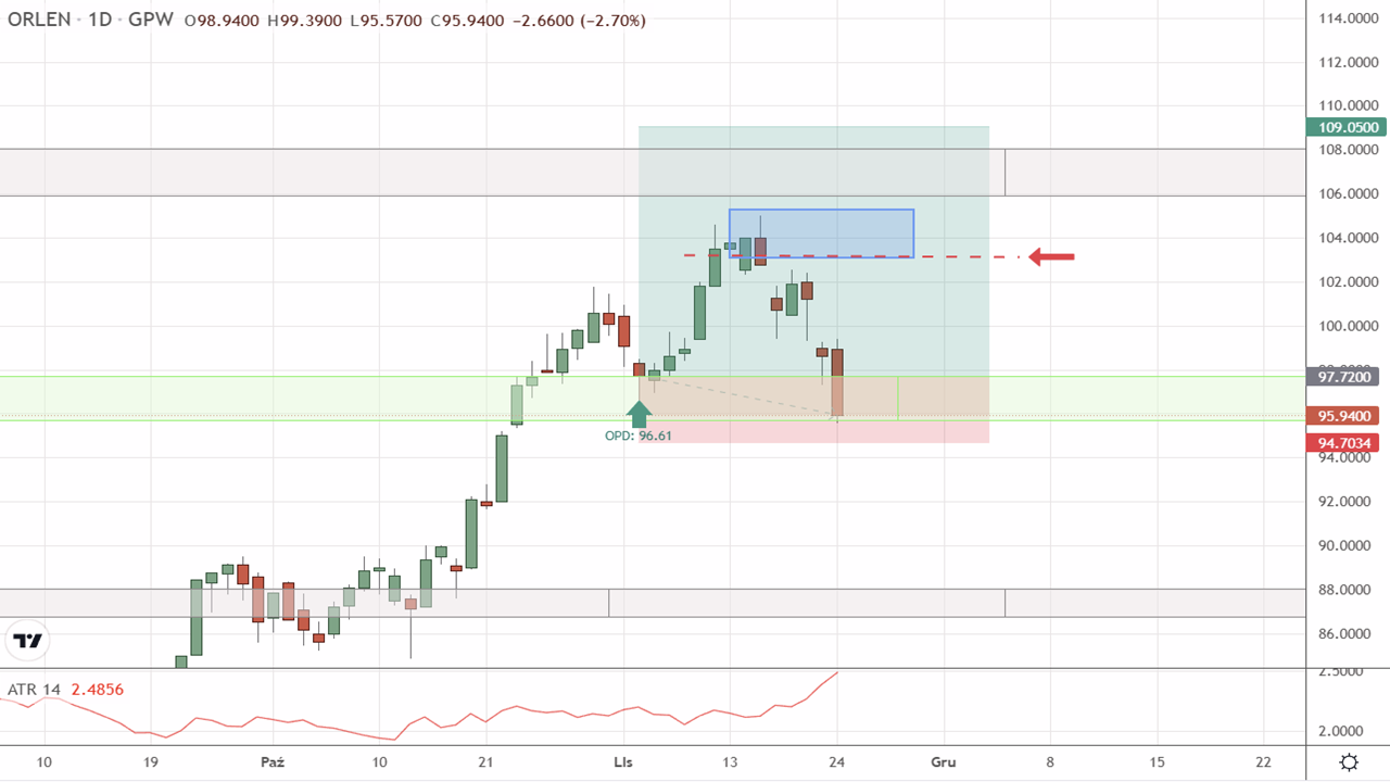 Sprzedaż akcji Orlen S.A. (PKN:GPW). Zamknięcie pozycji na poziomie Stop loss wynikającym z prowadzenia pozycji po ATR. Transakcja przyniosła 5,51% zysku po 13 dniach.