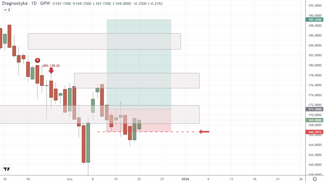 Sprzedaż akcji Diagnostyki S.A. (DIA:GPW). Zamknięcie pozycji na ustalonym poziomie Stop loss. Transakcja przyniosła stratę -2,69% po 6 dniach.