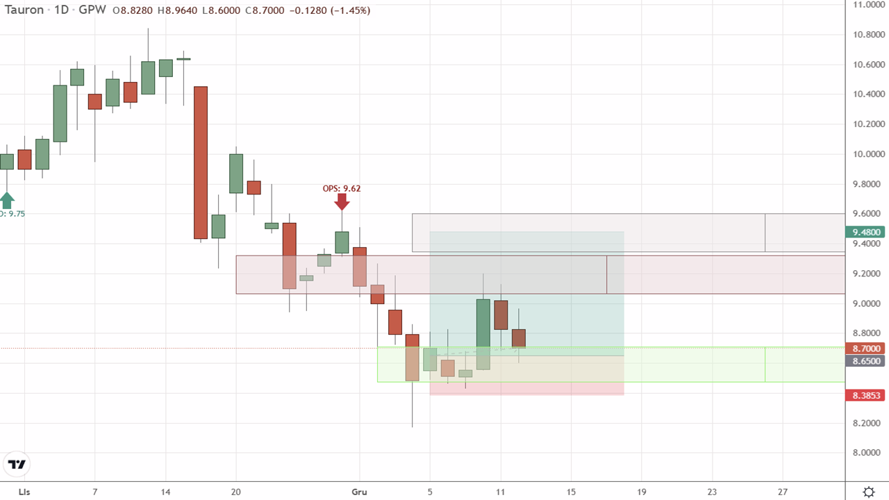 Sprzedaż akcji Tauron Polska Energia S.A. (TPE:GPW). Zamknięcie pozycji z powodu aktywacji strefy podaży Squabera. Transakcja przyniosła 4,39% zysku po 5 dniach.