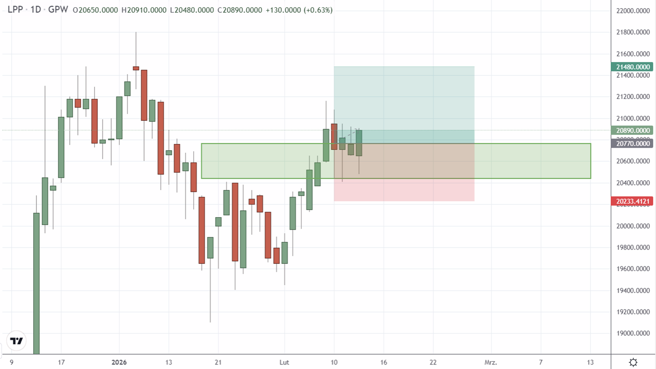 W Polsce korekta na mniejszych spółkach (WIG -0,62%; WIG20 -0,97%; mWIG40 -0,20%; sWIG80 +1,84%). Polski złoty znacznie umocnił się względem dolara (USD/PLN -0,64%) jak i względem euro (EUR/PLN -0,20%). Bieżąca analiza polskiego złotego znajduje się w najnowszym materiale Otwarcie Tygodnia – link do materiału.