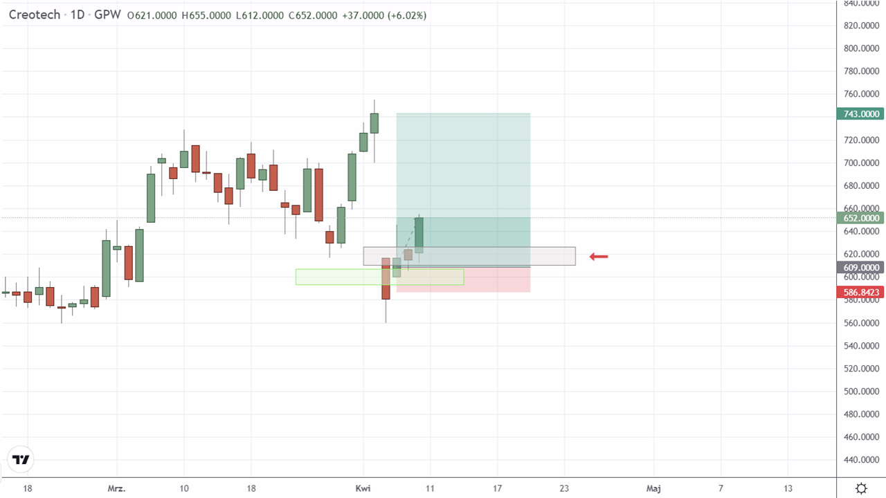Sprzedaż akcji Creotech Instruments S.A. (CRI:GPW). Zamknięcie pozycji z powodu aktywacji strefy podaży Squabera. Transakcja przyniosła 0,99% zysku po jednym dniu.