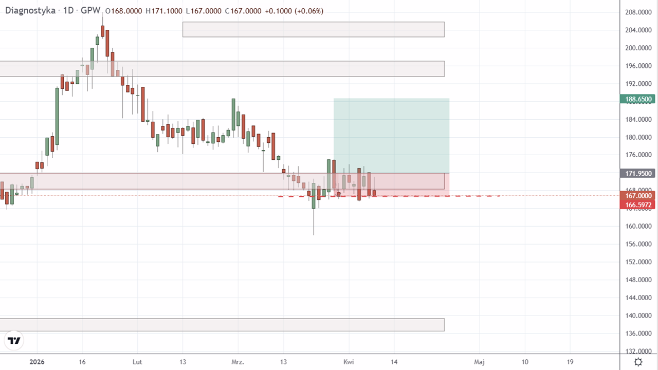 Sprzedaż akcji Diagnostyki S.A. (DIA:GPW). Zamknięcie pozycji na ustalonym poziomie Stop loss. Transakcja przyniosła stratę -2,12% po 11 dniach.