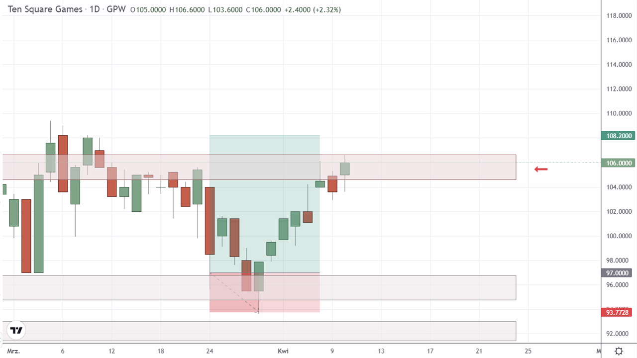 Sprzedaż akcji Ten Square Games S.A. (TEN:GPW). Zamknięcie pozycji z powodu aktywacji strefy podaży Squabera. Transakcja przyniosła 7,73% zysku po 15 dniach.
